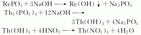 独居石碱溶饼硝酸法:独居石精矿与50%氢氧化钠于140℃下分解反应5h,碱:矿为1.3(质量比),后用热水稀释反应物,并在70℃下保温陈化,经分离得独居石碱溶饼。将碱溶饼用硝酸全溶,用30%磷酸三丁酯(TBP)萃取铀钍,水相为硝酸稀土溶液,可用于提取稀土。铀钍进入有机相,用纯水反萃得铀钍反萃液,经浓缩后用6%的磷酸三丁酯萃取铀,用40%TBP煤油液萃取钍,再经反萃、浓缩、结晶,制得硝酸钍。其反应式如下: