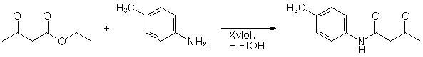 In einem 250-ml-Dreihals-Rundkolben werden 80 ml Acetessigsäure-ethylester vorgelegt. Der Kolben wird mit Destillierbrücke samt Vorlage, beheizbarem Tropftrichter und Thermometer (bis 200 °C) versehen. In dem Tropftrichter wird eine 60 °C heiße Lösung von 21.4 g p-Toluidin in 60 ml Xylol (Isomerengemisch) vorgelegt. Der Tropftrichter wird mit 60 °C warmem Wasser temperiert. Anschließend erhitzt man den Acetessigsäure-ethylester mit Hilfe eines Ölbads auf 160 °C und lässt dann langsam die Lösung aus dem Tropftrichter zufließen. Die Geschwindigkeit ist dabei so zu regeln, dass etwa die gleiche Menge an Lösung zugegeben wird, wie Xylol abdestilliert. Sobald die gesamte Lösung aus dem Tropftrichter zugegeben wurde, überführt man das Reaktionsgemisch in eine Vakuumdestillationsapparatur und engt im Vakuum auf ein Volumen von 50 ml ein. Den Rückstand gießt man noch heiß in eine vorgewärmte Porzellanschale. Das erstarrende Produkt wird nach dem Abkühlen pulverisiert, mit Cyclohexan verrieben und abgesaugt. Im Anschluss daran trocknet man das N-Acetoacetyl-p-toluidin im Trockenschrank bei 60 °C. Die Ausbeute beträgt 31-32 g eines zwischen 90 und 91°C schmelzenden Produktes. Dies entspricht 82-84% der theoretisch erreichbaren Ausbeute.