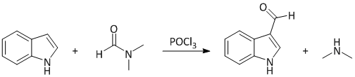5 ml (55 mmol) Phosphoroxychlorid werden bei 10 - 20 °C unter ständigem Rühren und unter Schutzgas in 17 ml trockenes N,N-Dimethylformamid (DMF) getropft. Anschließend werden bei 20 - 30 °C 5.85 g (50 mmol) Indol in 4 ml trockenem DMF hinzugetropft. Nach vollständiger Zugabe erwärmt man nochmals 45 min auf 35 °C und gibt danach die Reaktionslösung auf Eis. Die rote Lösung wird vorsichtig bei 20 - 30 °C mit 50 ml Natriumhydroxid-Lösung (9.5 g NaOH [240 mmol] in 50 ml Wasser) versetzt. Das letzte Viertel der Lösung wird aufeinmal hinzugegeben und die Suspension schnell für eine Minute zum sieden erhitzt. Der Feststoff wird absaugt, mit 5 x 25 ml Wasser nachgewaschen und im Vakuum getrocknet. Man erhält 6.25 g (86% d.Th.) an hellgelben Indol-3-carbaldehyd.