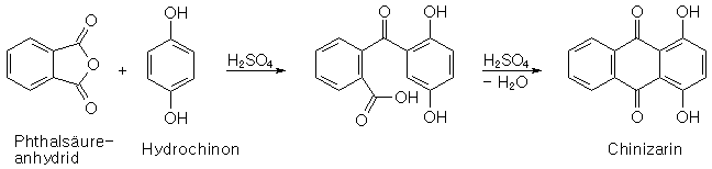 Die Synthese des Chinizarins besteht in der Kondensation von Phthalsäureanhydrid mit Hydrochinon. Es handelt sich bei dieser Reaktion um eine zweifache Friedel-Crafts-Acylierung. Hydrochinon reagiert durch seine zwei Hydroxylgruppen leicht mit Elektrophilen und braucht für die Friedel-Crafts-Reaktion mit dem Phthalsäureanhydrid nicht das übliche Aluminiumtrichlorid als Katalysator, da Protonenkatalyse hier genügt. Nach der säurekatalysierten Ringöffnung des Phthalsäureanhydrids greift das entstandene Carbeniumion in einer ortho-Stellung zu einer der beiden Hydroxylgruppen das Hydrochinon an. Bei dem Angriff handelt es sich um eine elektrophile aromatische Substitution. Die zunächst entstehende Carbonsäure wird durch konzentrierte Schwefelsäure zum entsprechenden Hydroxyanthrachinon zyklisiert. Der Ringschluss führt zur Ausbildung des mesomeren π-Elektronensystems.
