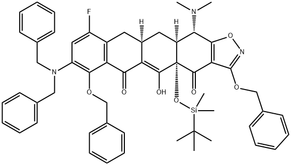 (4aS,11aR,12aS,13S)-3,7-bis(benzyloxy)-4a-((tert-butyldimethylsilyl)oxy)-8-(dibenzylamino)-13-(dimethylamino)-10-fluoro-5-hydroxy-11a,12,12a,13-tetrahydrotetraceno[2,3-d]isoxazole-4,6(4aH,11H)-dione 구조식 이미지