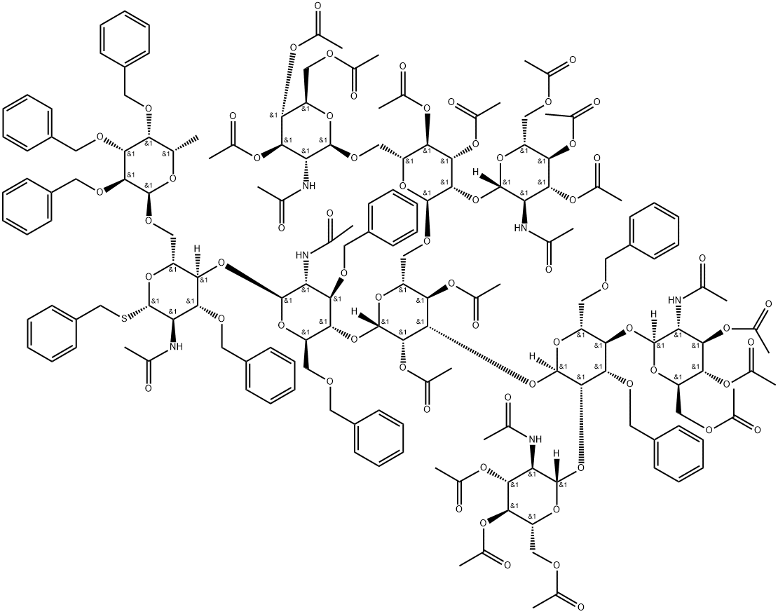 Phenylmethyl O-3,4,6-tri-O-acetyl-2-(acetylamino)-2-deoxy-beta-D-glucopyranosyl-(1-2)-O-[3,4,6-tri-O-acetyl-2-(acetylamino)-2-deoxy-beta-D-glucopyranosyl-(1-4)]-O-3,6-bis-O-(phenylmethyl)-alpha-D-mannopyranosyl-(1-3)-O-[O-3,4,6-tri-O-acetyl-2-(acetylamino)-2-deoxy-beta-D-glucopyranosyl-(1-2)-O-[3,4,6-tri-O-acetyl-2-(acetylamino)-2-deoxy-beta-D-glucopyranosyl-(1-6)]-3,4-di-O-acetyl-alpha-D-mannopyranosyl-(1-6)]-O-2,4-di-O-acetyl-beta-D-mannopyranosyl-(1-4)-O-2-(acetylamino)-2-deoxy-3,6-bis-O-(phenylmethyl)-beta-D-glucopyranosyl-(1-4)-O-[6-deoxy-2,3,4-tris-O-(phenylmethyl)-alpha-L-galactopyranosyl-(1-6)]-2-(acetylamino)-2-deoxy-3-O-(phenylmethyl)-1-thio-beta-D-glucopyranoside 구조식 이미지