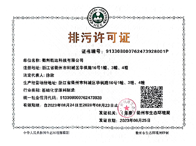 衢州乾达科技有限公司成立于2013年8月,注册地浙江省衢州市柯城区华枫路16号,位于衢州市智造新城。公司运用国内首创工艺进行多氟苯及其衍生物的研发并实现了工业化量产。