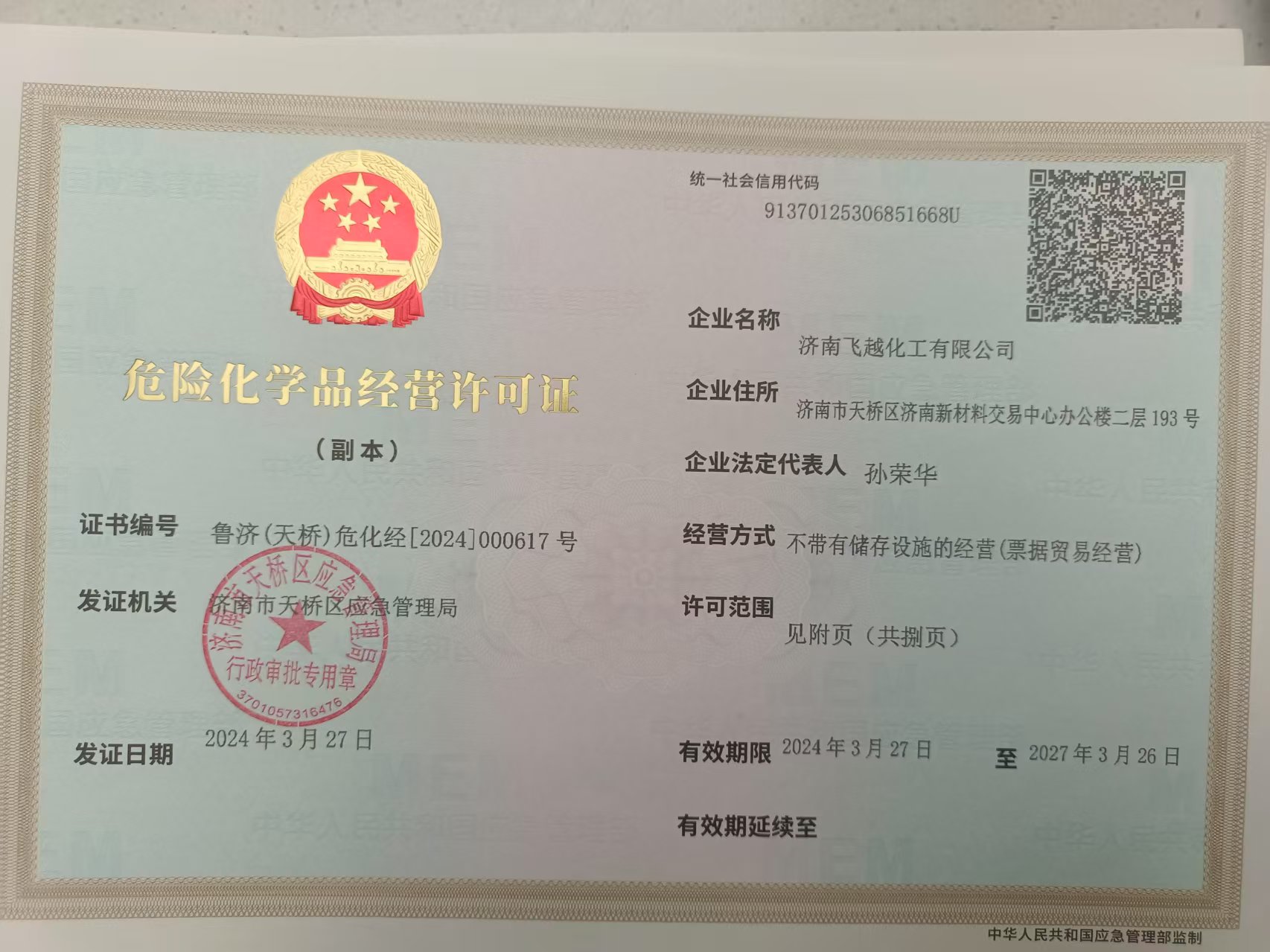 济南飞越化工有限公司,位于山东省最大的化工原料集散地--济南市新材料交易化工市场,是一家专营各类化工原料的经销批发企业。