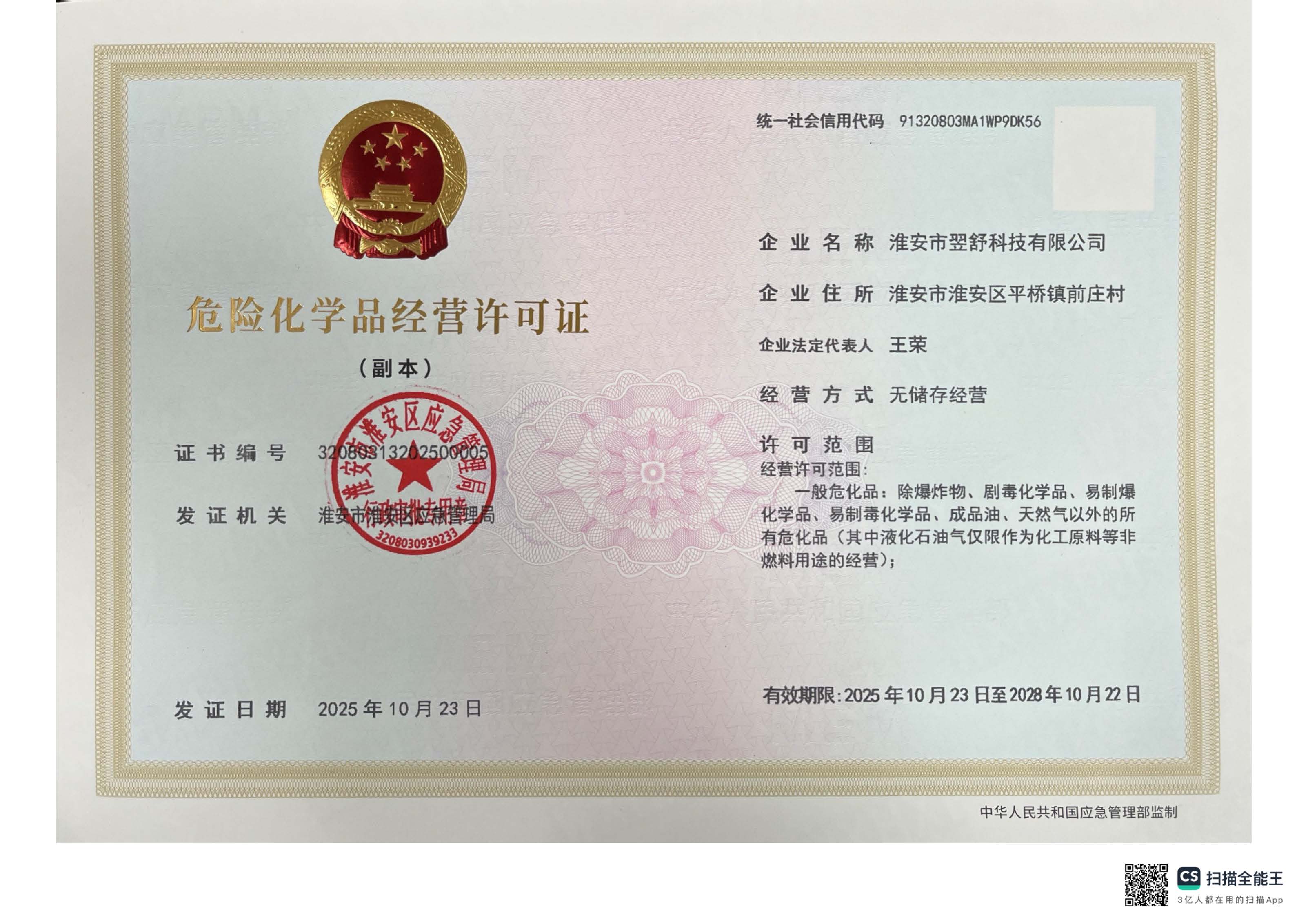 淮安市翌舒科技有限公司坐落于一代伟人周恩来总来家乡,紧邻京沪、宁连、盐宿徐高速公路及新长铁路,距淮安机场24公里,京杭大运河贯穿而过,水陆交通便利,公司致力于与各科研单位、化工生产企业进行有机化工学品的研制、开发与生产。