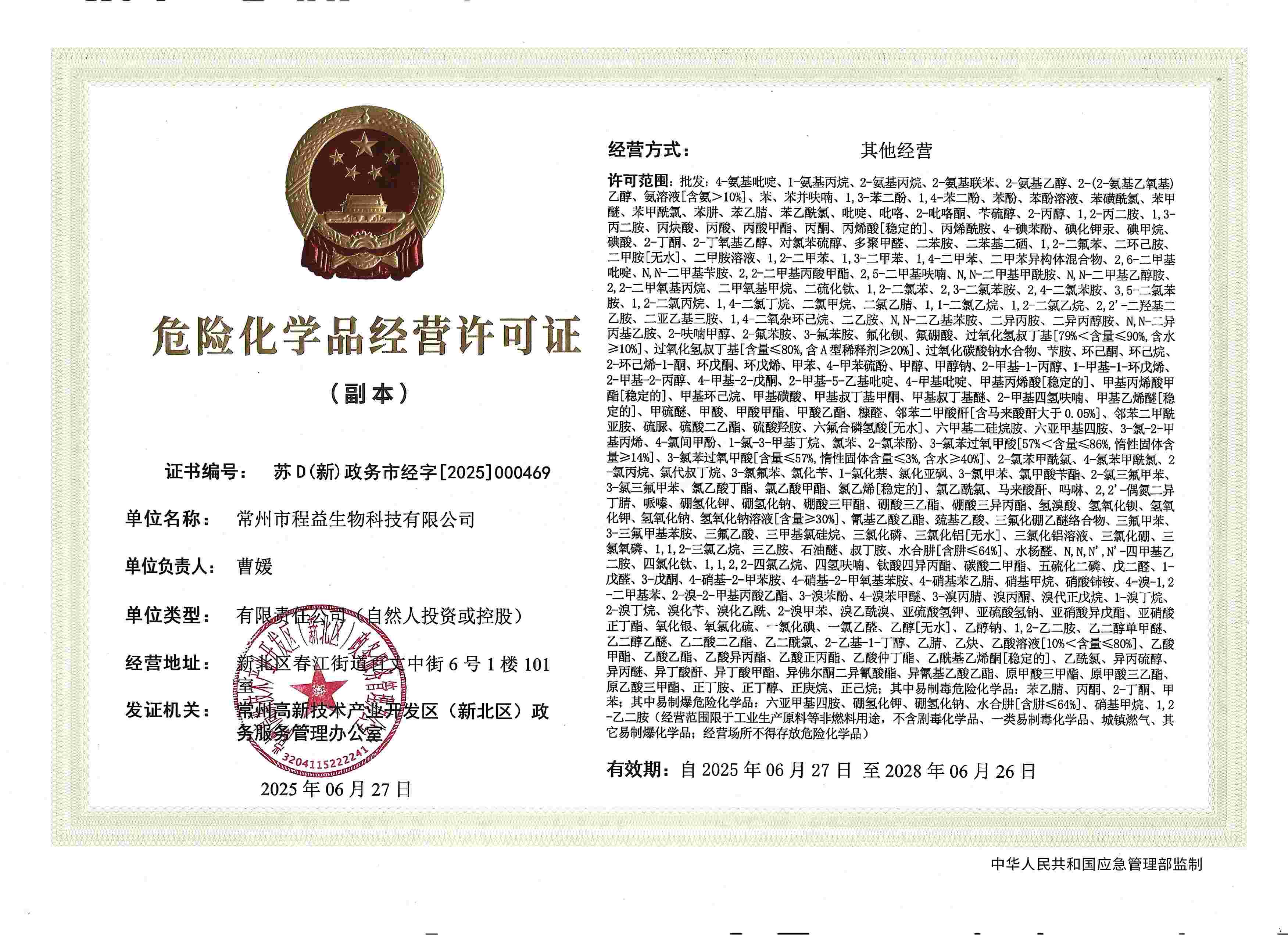 常州市程益生物科技有限公司成立于2022年03月02日。经营范围包括许可项目:危险化学品经营(依法须经批准的项目,经相关部门批准后方可开展经营活动,具体经营项目以审批结果为准)一般项目:化工产品销售(不含许可类化工产品);橡胶制品销售;生态环境材料销售;新型催化材料及助剂销售;石墨烯材料销售;工程塑料及合成树脂销售;电线、电缆经营;专用化学产品销售(不含危险化学品);合成材料销售;新型膜材料销售;新型有机活性材料销售;塑料制品销售;日用品销售;日用百货销售;家用电器销售;技术服务、技术开发、技术咨询、技术交流、技术转让、技术推广;机械设备销售(除依法须经批准的项目外,凭营业执照依法自主开展经营活动)