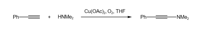 在氧气存在下,醋酸铜还能催化苯乙炔与二甲基胺的偶联反应,得到N,N-二甲基-2-苯基乙炔胺化合物。在没有氧气存在下,则生成1,4二苯基丁炔作为唯一的偶联产物。