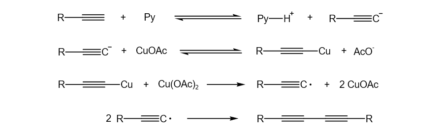 醋酸铜对碳负离子具有氧化活性。在吡啶存在下,端炔可以发生氧化偶联反应得到二炔化合物。
