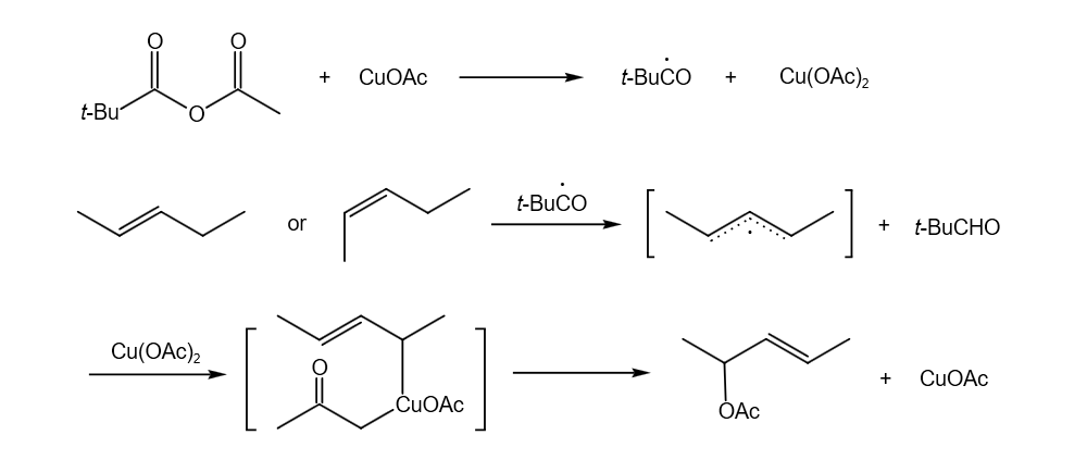 在醋酸铜催化下,过氧酯可以作用于丙烯化合物发生烯丙基氢被酰氧基取代的反应。该反应可能是先形成了烯丙基自由基,然后与Cu(II)快速反应得到Cu(III)中间体,最后经周环过渡态得到最终酰氧基取代烯烃。