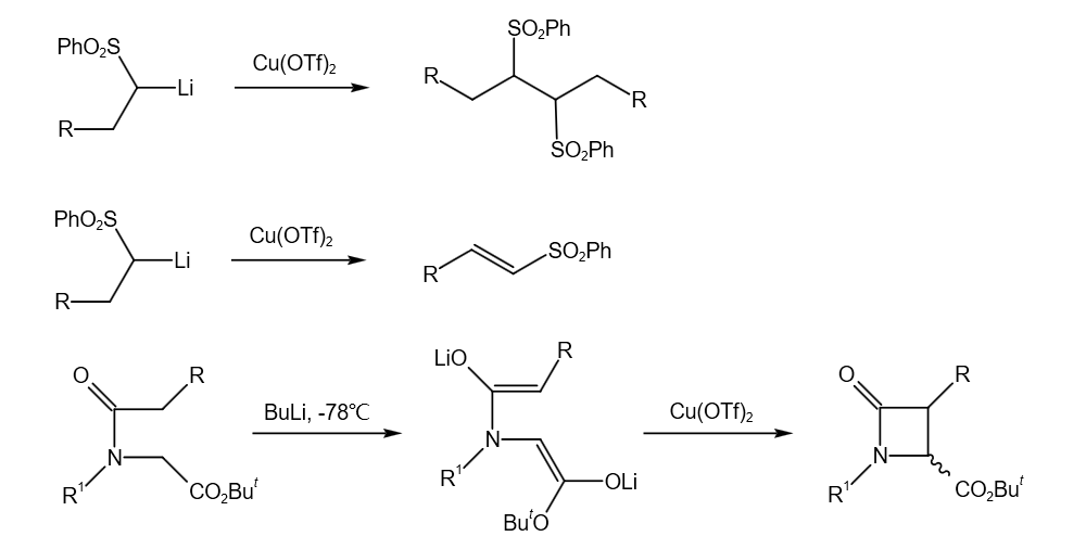 采用三氟甲基磺酸铜作为氧化剂,可以实现α-磺酰基锂碳负离子的自身偶联反应。但是,采用醋酸铜作氧化剂则可以将其氧化为α,β-不饱和砜化合物。其它碳负离子也能在醋酸铜作用下发生偶联反应,例如: β-内酰胺的合成。