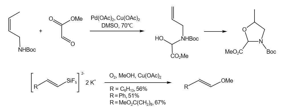在催化量醋酸钯和过量醋酸铜共同作用下,能够实现烯丙基的氧化反应。在甲醇和氧气氛围下,催化量的醋酸铜可以促进乙烯基Si-C键的断裂得到乙烯基醚化合物。该反应具有高度的立体选择性,完全得到反式烯醇醚,在水存在下得到相应的醛。
