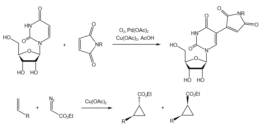 醋酸铜还能用作钯催化反应中的氧化剂,将还原后的低价钯重新氧化为Pd(II)。醋酸铜与手性亚胺生成的配合物能诱导烯烃与重氮乙酸酯的不对称环丙化反应。