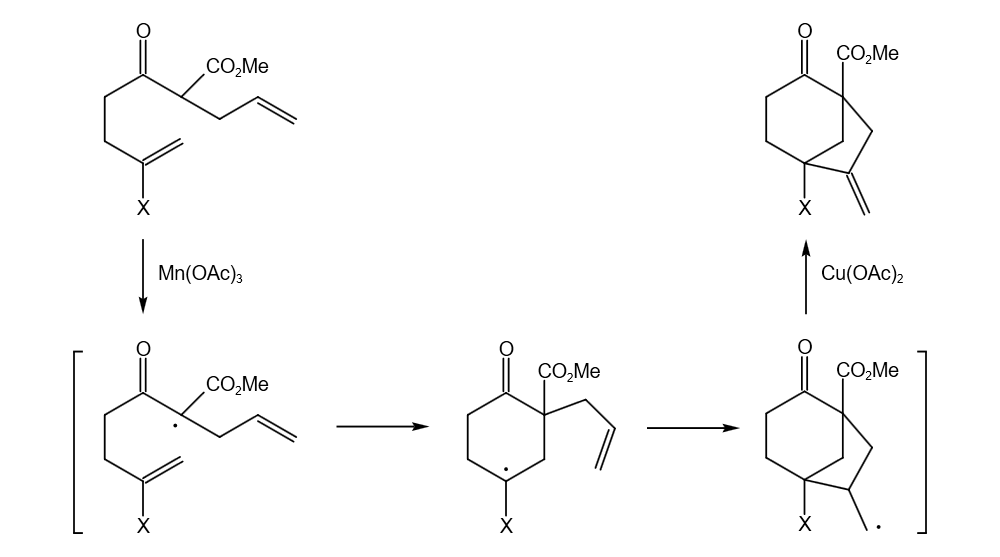 与自由基引发剂联合使用,醋酸铜还能参与自由基的氧化反应。如下图所示: β-羰基酯首先在Mn(OAc)3氧化下得到自由基,然后经分子内环化得到烷基自由基,最后在醋酸铜作用下被氧化为相应的烯烃。