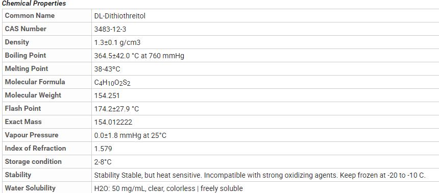 2. Excellent reagent for maintaining the ?SH group in a reduced state; quantitative reduction of disulfide; DTT can effectively