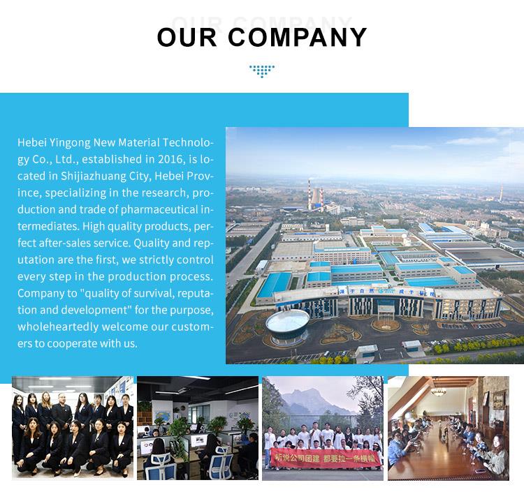 HEBEI YINGONG NEW MATERIAL TECHNOLOGY CO.,LTD. is a professional Manufacturer of API&Pharmaceutical intermediates in China. We have a registered capital of 1 million yuan and is one of the most dynamic foreign trade companies in the Chinese market. We have a pharmaceutical raw material production plant and a reagent R&D center. We now have the most complete product line. In addition, we have developed and produced tens of thousands of reagents. We also have the business of custom synthesis of various organic compounds as a supplement. We can synthesize almost all chemicals. Our goal is to survive by quality and develop by credit.