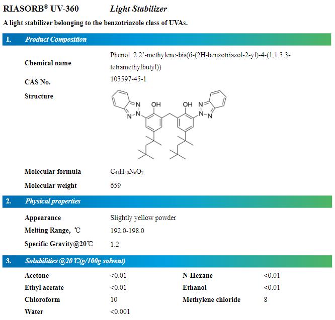 | Product Name: Light Stabilizer UV-Absorber RIASORB UV-360/360FF | CAS No.: 103597-45-1 |