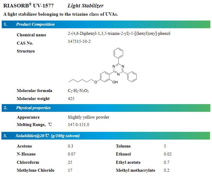 | Product Name: Light Stabilizer UV-Absorber RIASORB UV1577 | CAS No.: 147315-50-2 |