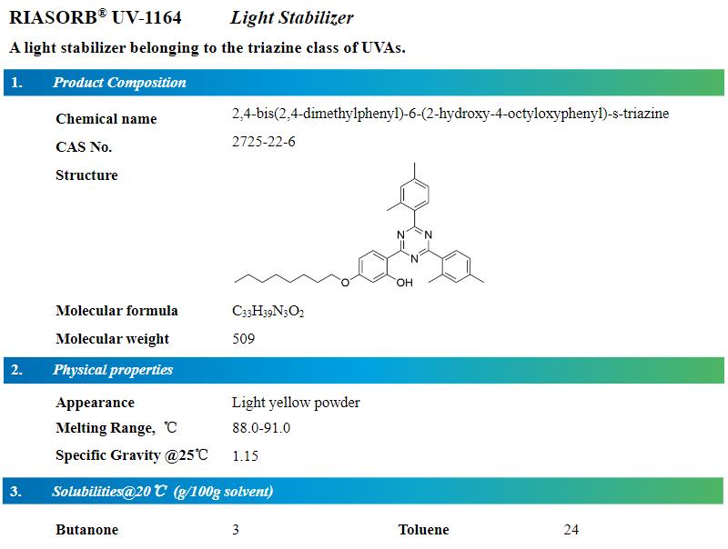 | Product Name: Light Stabilizer UV-Absorber RIASORB UV1164 | CAS No.: 2725-22-6 |