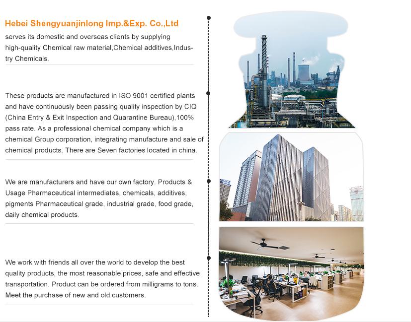 Hebei Shengyuan Jinlong Imp. & Exp. Co., Ltd. is a modern advanced enterprise specializing in production and exportation of APIs, peptides, plant extracts etc., has invested and closed cooperated with domestic manufacturers qualified with GMP, DMF, FDA and Laboratories from famous Universities to meet the different customers needs from grams to tonnage quantity, which makes Hebei Shengyuan Jinlong to be more flexible and easily to supply highly cost-effective products with high quality and better service to customers. Hebei Shengyuan Jinlong is always stands in high starting, is a modern advanced enterprise specializing in production and exportation of APIs, peptides, plant extracts etc., has invested and closed cooperated with domestic manufacturers qualified with GMP, DMF, FDA and Laboratories from famous Universities to meet the different customers needs from grams to tonnage quantity, which makes Hebei Shengyuan Jinlong to be more flexible and easily to supply highly cost-effective products with high quality and better service to customers