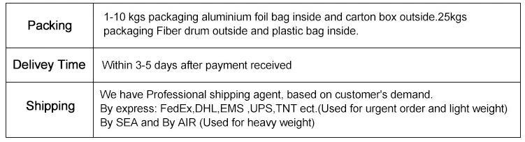 A: Our MOQ is 1kg. But usually access quantities such as 1/10/100g on the condition that the sample charge is 100% paid.