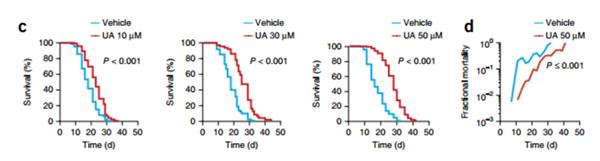 When the concentration of urolithin A increases from 10 µ M to 50 µ M, there is a significant dose-response effect on lifespan. At 50 µ M, UA significantly delayed the mortality rate of elderly patients (P ≤ 0.001).