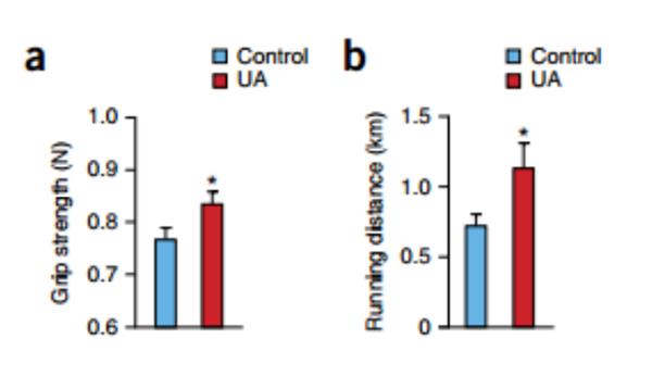 We evaluated the effect of urolithin A treatment on preventing age-related muscle decline in 16 month old male C57BL/6J mice fed a high-fat diet (HFD). Starting from the age of 16 months, we added 50mg/kg/d of UA to the diet and continued for another 8 months. We found that long-term use of UA does not affect weight gain or the evolution of fat and lean body mass (Supplementary Figure 7c). At 22 and 24 months of age, compared to the control group mice fed hfd, treatment with urolithin A resulted in a significant increase in muscle function. Although there was no change in muscle mass, grip strength increased by 9% and spontaneous exercise levels measured using running wheels increased by 57% (n=25 mice).