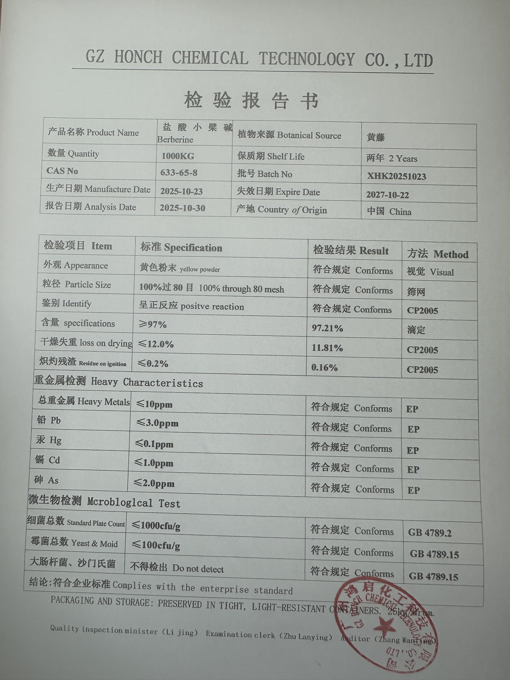 | Product Name: berberine chloride | CAS No.: 633-65-8 |