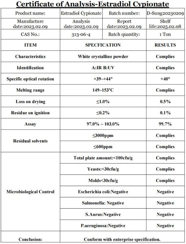 Estradiol Cypionate is a white or milky or amorphous powder. Soluble in dioxan and aceton, slightly soluble in ethanol, insoluble in water. Estradiol, an intermediate between estradiol valerate and estradiol benzoate, is an estrogenic drug. It can be used to treat functional uterine bleeding, primary amenorrhea, menopausal syndrome and prostate cancer. Estradiol can promote and regulate the normal growth of female sexual organs and secondary sexual characteristics, promote the maturation and growth of mammary ducts, and help with positioning.