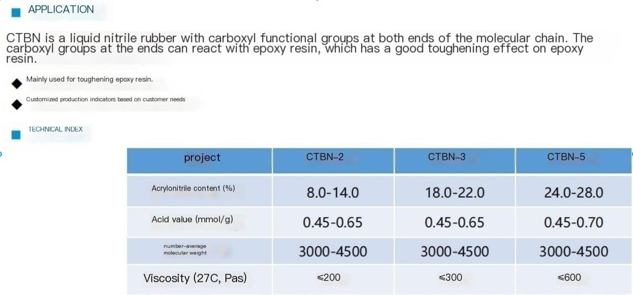 Carboxylated- terminated liquid acrylonitrile rubber (CTBN) is a kind of liquid remote claw polymer, because it contains active carboxyl group at both ends of the molecular chain, has the performance of rereaction chain expansion, widely used, is the best toughening agent of thermosetting resin. CTBN introduces acrylonitrile in the main chain, which has strong polarity and high and low temperature performance, stability, and blending properties with resin, oil resistance, and crack resistance.
