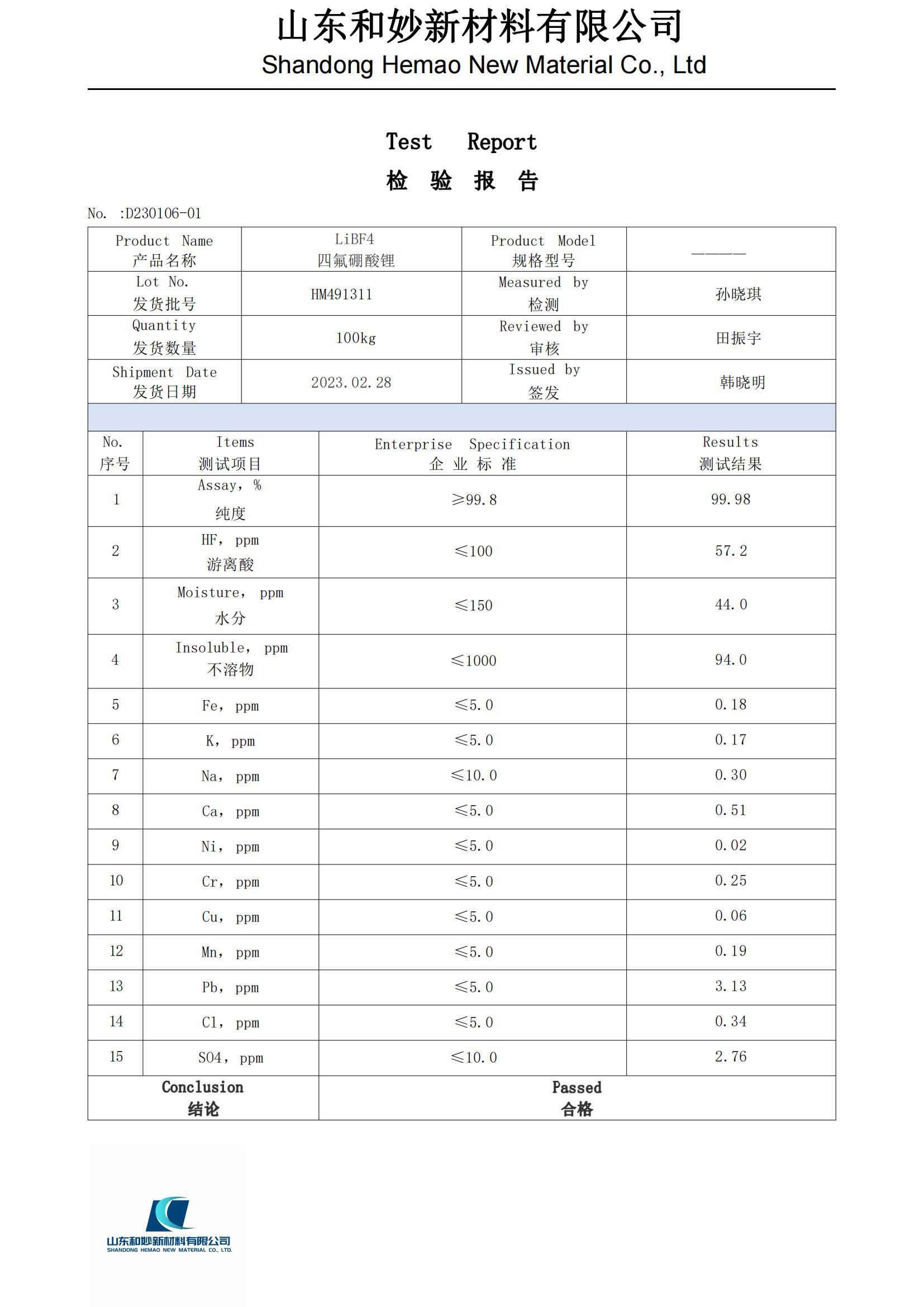 | Product Name: Lithium tetrafluoroborate | CAS No.: 14283-07-9 |
