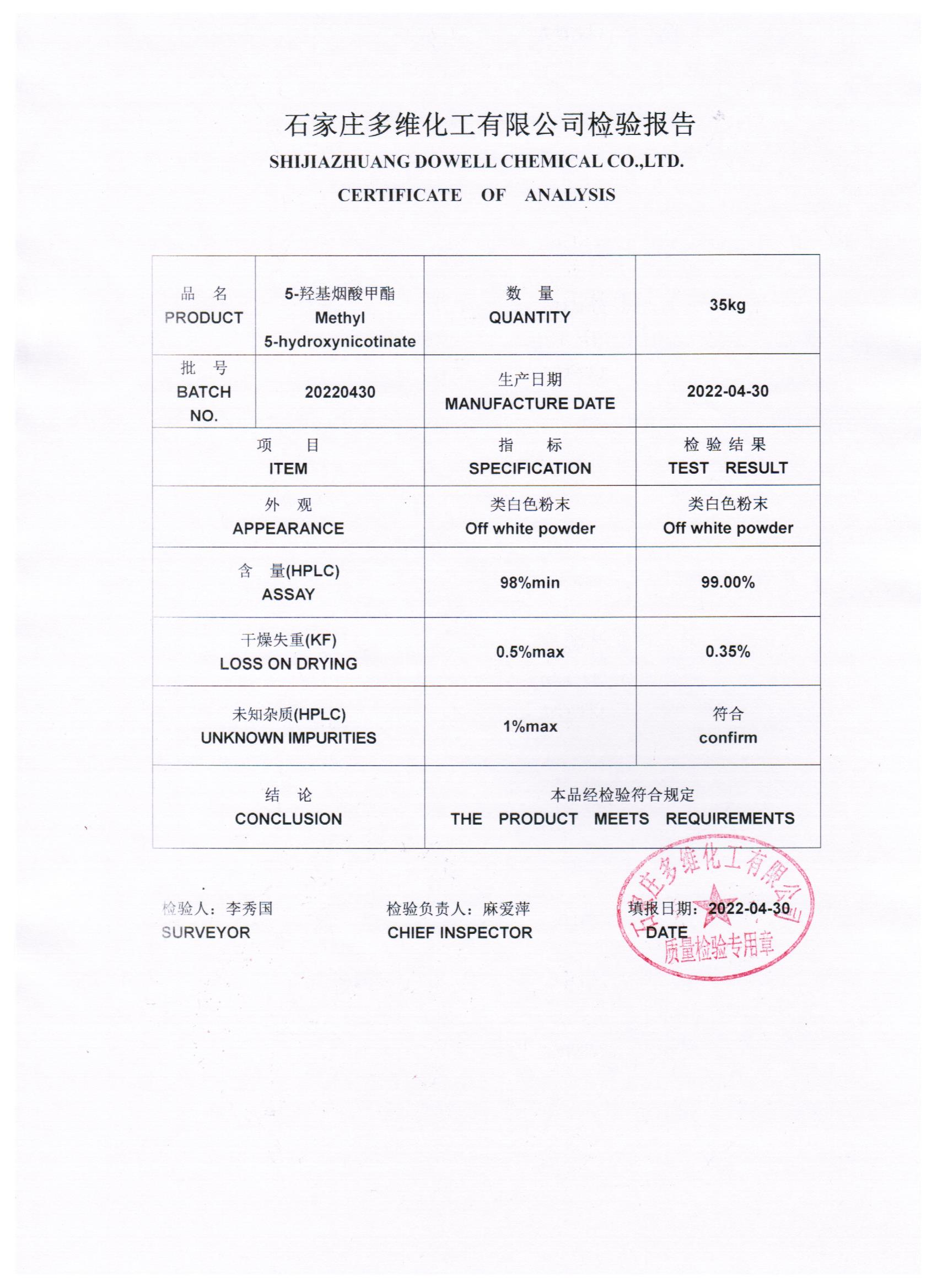 Nearly sixty kinds of products have been successfully developed, Main products include: 2-Aminoisonicotinic acid and its methyl ester,2-Mercaptonicotinic acid, 2-Aminonicotinic acid, 5-Hydroxynicotinic acid and its methyl ester, 4-Chloronicotinic acid,4
