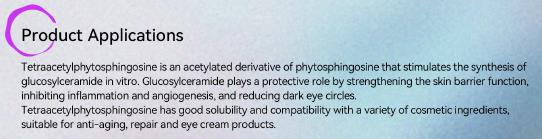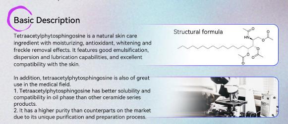 Function: Tetraacetyl phytosphingosine is a natural skincare ingredient with moisturizing, antioxidant, whitening, and spot removing effects. It has significant effects in promoting self repair of the skin barrier and is a potential drug for treating skin diseases. It has good emulsifying, dispersing, and lubricating abilities, excellent compatibility with the skin, and is widely used in the fields of cosmetics and skincare. It has moisturizing, whitening, spot removing, antioxidant and other effects. In addition, tetraacetyl phytosphingosine also has great potential in the medical field, as it has anti-inflammatory effects and is a potential topical drug for treating chronic inflammatory skin diseases.