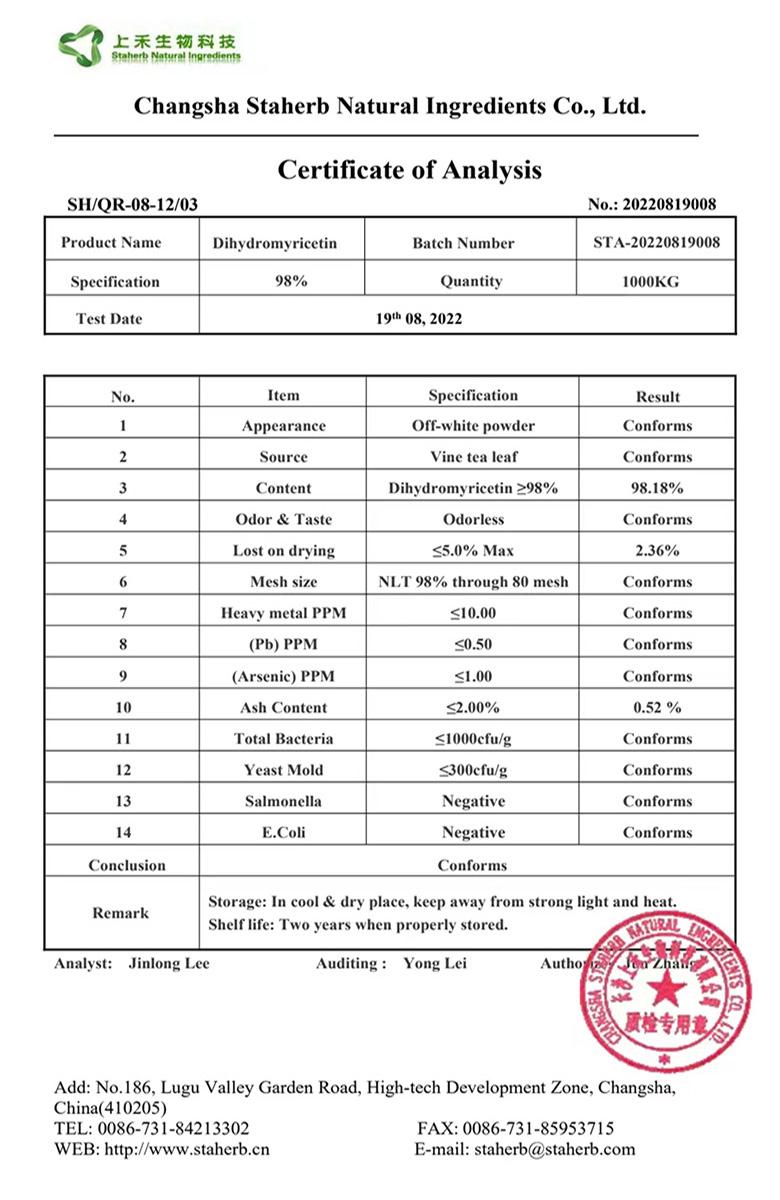 Ampelopsis Grossedentata (Snake Wine Vine, also called Vine Tea or Teng Cha in China). 98% Vine Tea Extract Dihydromyricetin is a White to a light yellow fine powder with good fluidity. It is produced in Staherb factory and has perfect product testing standards to ensure stable product quality.