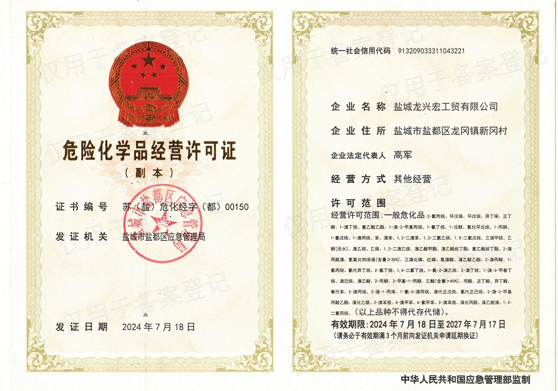 盐城龙兴宏工贸有限公司是一家专业从事溴代物和氯代物化工产品的研发、生产和销售为一体的高科技民营企业。公司成立于1991年,坐落于长江三角洲中心城市—盐城, 2009年公司生产基地搬迁至盐城阜宁县澳洋工业园,占地80000多平方米,总投资1亿元人民币。并拥有自营进出口权,其营销网络遍布各地。