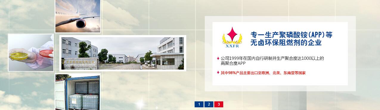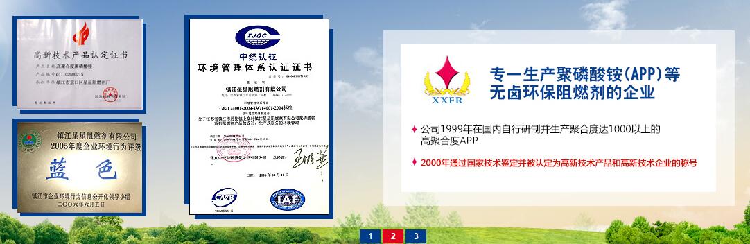 镇江星星阻燃剂有限公司成立于1991年,位于文化历史名城的江苏镇江市,是专一生产聚磷酸铵(APP)等无卤环保阻燃剂的企业,公司1999年在国内自行研制并生产聚合度达1000以上的高聚合度APP,2000年通过国家技术鉴定并被认定为高新技术产品和高新技术企业的称号,先后通过了ISO9001的国际质量体系认证 和1SO14001的国际环境体系认证,其中98%产品主要出口至欧洲、北美、东南亚等国家。