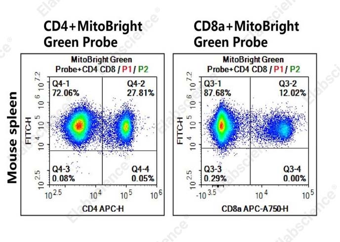 小鼠脾脏细胞与 APC Anti-Mouse CD4 抗体(货号 E-AB-F1097E)、Elab Fluor® Red 780 Anti-Mouse CD8a 抗体(货号 E-AB-F1104S)共染,通过流式细胞仪分析 CD4+、CD8a + 细胞的线粒体状态(如实验数据显示,CD4 + 细胞中 MitoBright Green 阳性率达 72.06%,CD8a + 细胞中阳性率达 87.68%)