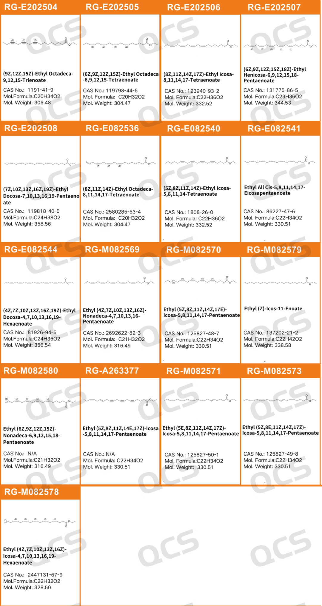 由于二十碳五烯酸乙酯对强酸强碱、干燥高温、强光潮湿的环境较为敏感,结构中的顺式双键可能发生异构化,生成相应顺反异构体杂质。所以为了严格把控对二十碳五烯酸乙酯的药物质量控制,我司对二十碳五烯酸乙酯的16种有关物质进行了研究。