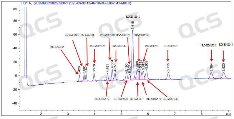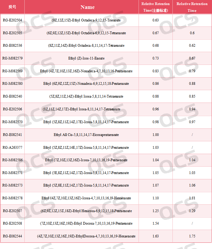 根据以上结果我们可以看到各有关物质的相对保留时间均在标准要求之内,我司成功实现了对16种二十碳五烯酸乙酯杂质的研发,生产和监测分析。