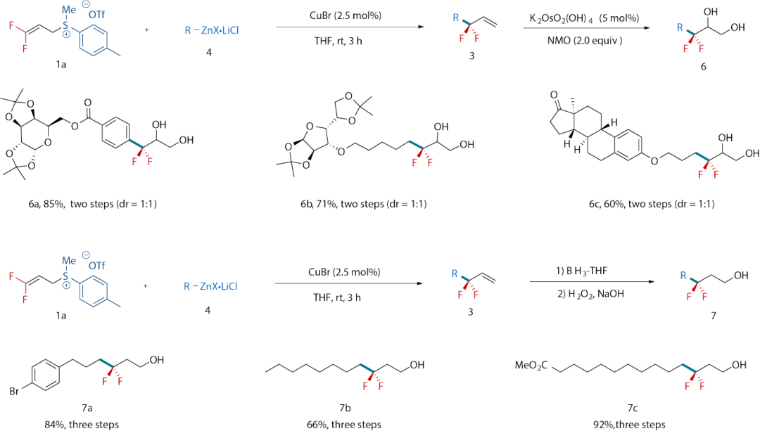 在低催化剂用量CuBr催化下,DFAS试剂(图2,化合物1a,cas# 2839167-38-1)可与各种芳基或烷基锌试剂高区域选择性地生成系列偕二氟烯丙基化合物,后者可以通过产物中烯烃的各种反应(如环丙烷化、双羟化、烯烃复分解反应等)实现进一步化学转化[1]。
