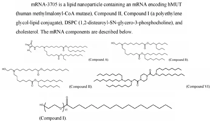 OL-56在此前Moderna公开的专利信息中作为一种聚乙二醇化脂肪酸衍生物(属Formula (VI)结构),其显著特征为PEG末端为羟基(-OH),即一种HO-PEG脂质。该类PEG脂质在多项专利文件中与不同可离子化脂质(如Compound A、B、II、VI等)配合使用,展现出良好的兼容性和递送效率。专利WO2022246020A1中公开了mRNA-3705的配方,至此可以明确专利中公开的Compound I就是文中的OL-56。
