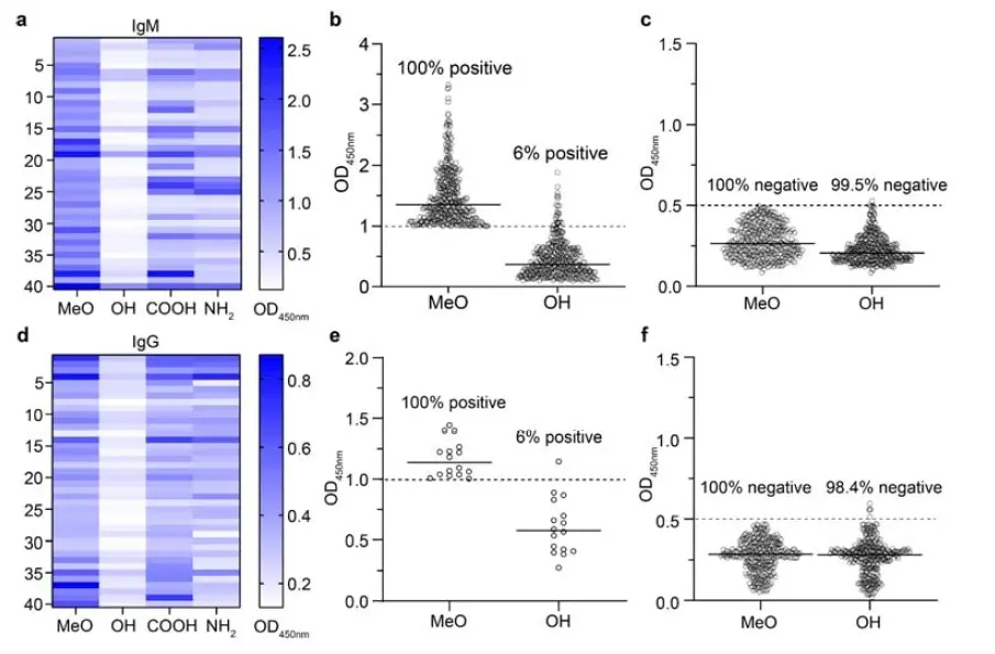 该研究综合运用ELISA、等温滴定量热法(ITC)及多种体外功能性实验,系统比较了不同末端结构PEG材料(包括MeO-、HO-、NH₂-和COOH-PEG)与抗体的结合特性。下图结果显示,HO-PEG在所有测试中均表现出最低的免疫识别率,阳性结合信号下降超过90%。尤其值得注意的是,研究还通过跨物种比较揭示:人类预存抗体主要识别PEG末端结构,而动物模型中诱导产生的抗体则多靶向PEG重复单元——这一关键差异提示HO-PEG的优势在临床环境中具备高度特异性与转化潜力。