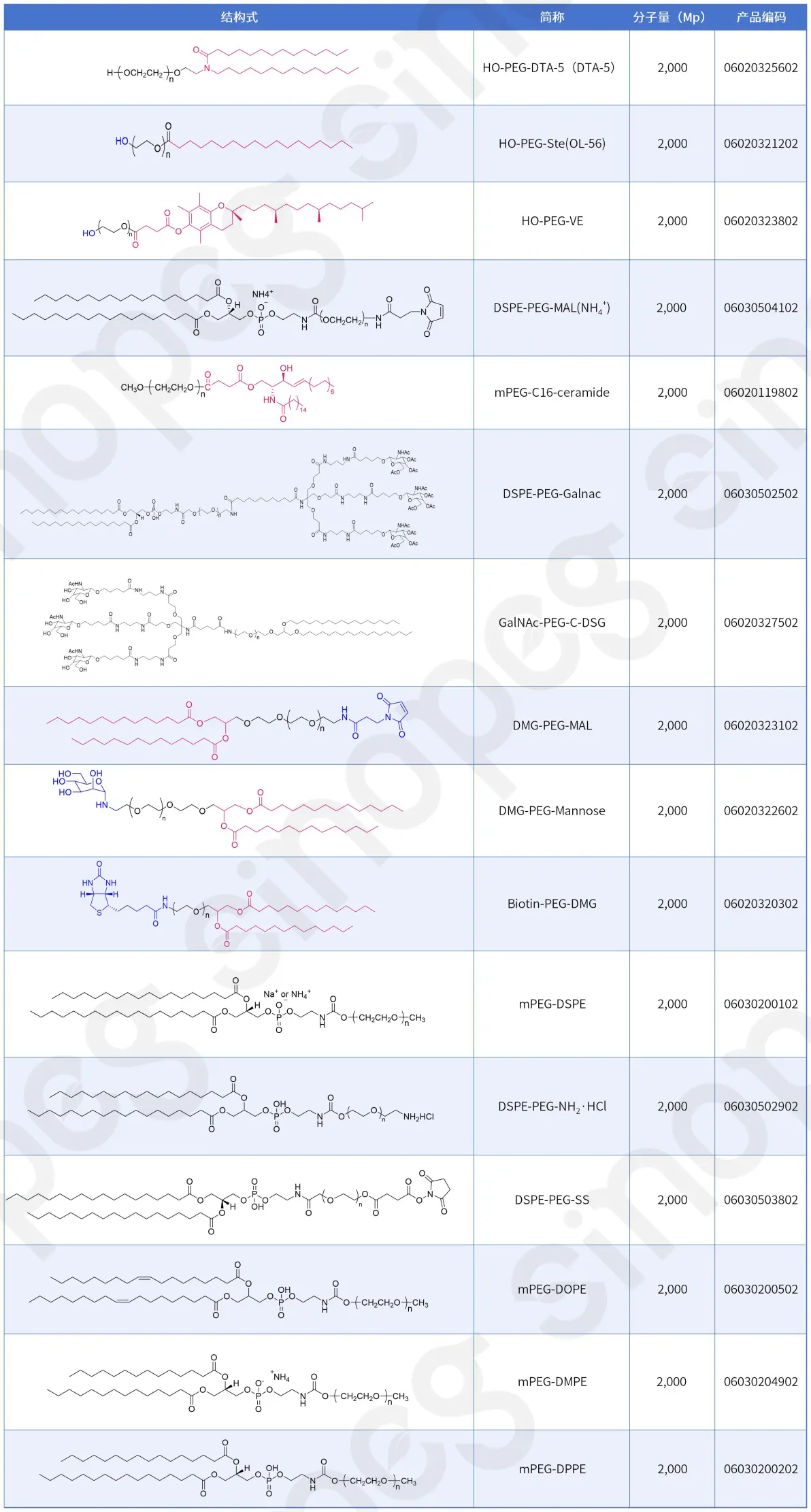 赛诺邦格不仅提供了HO-PEG脂,还推出了其他新型PEG-脂质结构: DSPE-PEG-MAL、GaINAC-PEG-C-DSG、OL-56(HO-PEG-Ste)、mPEG-C16-ceramide、mPEG-DHE-、Biotin-PEG-DMG、DMG-PEG-MAL、HO-PEG-VE、DMG-PEG-Mannose、DSPE-PEG-Galnac、mPEG-DPPE(14:0 PEG2000)、mPEG-DMPE(16:0 PEG2000 PE-2K)、mPEG-DOPE(18:1 PEG2000 PE-2K)。