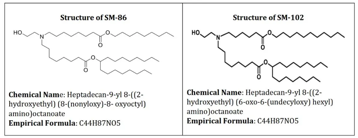 SM-86在此前SPIKEVAX®的非临床评审报告中有提及,是一种与SM-102结构相似的脂质,且对大鼠的静脉注射研究中,其药代动力学、组织分布和排泄的表现也与SM-102类似,且为早年Moderna对脂质递送载体研究中提及的Lipid 5。