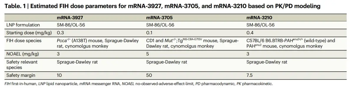 如下表1所示,基于PK/PD建模的结果,三种mRNA治疗剂(mRNA-3927、mRNA-3705和mRNA-3210)的预估FIH剂量分别为:0.3 mg/kg、0.1 mg/kg 和 0.4 mg/kg。这些数值均显著低于其相应无观察到不良反应水平(NOAEL),即PA 3 mg/kg,MMA 5 mg/kg,PKU 3 mg/kg,安全边际分别达到10、50和7.5,显示出优异的临床安全性潜力。
