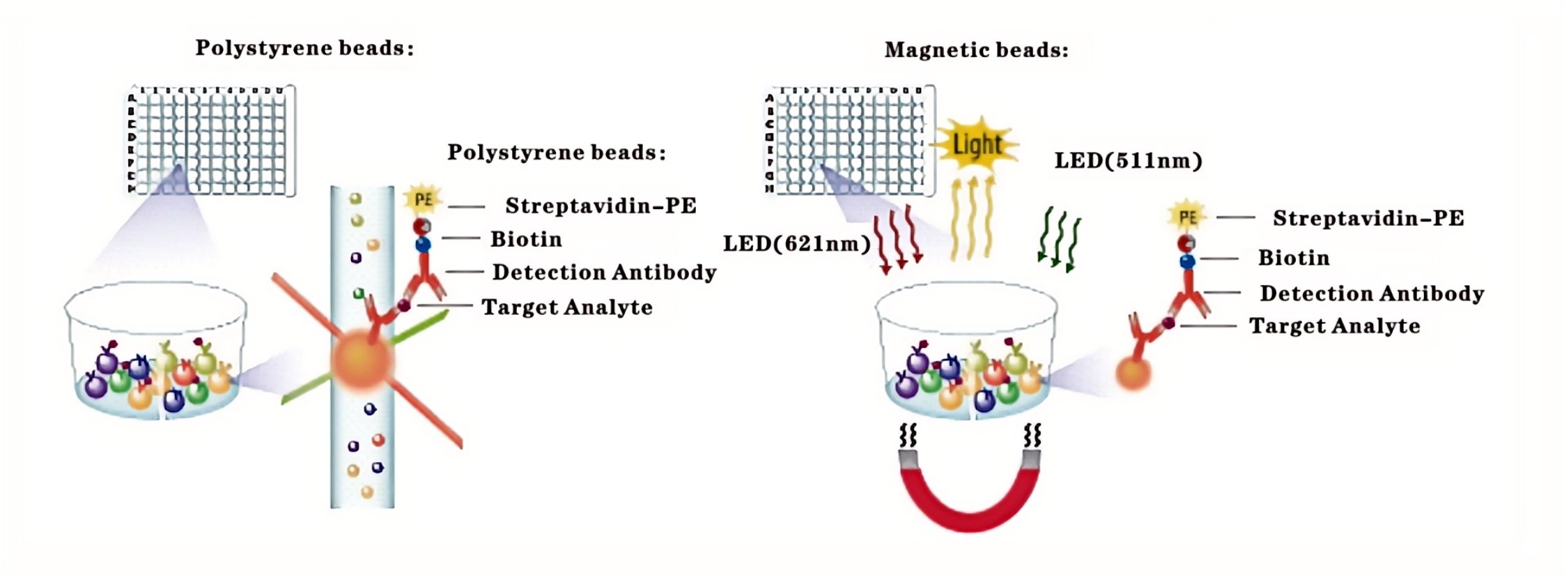 检测时,仪器通过双激光系统完成定性与定量分析:635nm 红色激光识别微球表面的荧光编码,精准判定对应靶标类型;532nm 绿色激光检测微球上报告分子(如 PE 荧光基团)的信号强度,信号强度与靶标蛋白结合量呈正相关,从而实现对目标分子的精准定量。该技术突破了传统单一检测技术的局限,实现了 “一次实验、多重检测” 的核心需求,完美适配复杂疾病中多因子协同调控的研究场景。