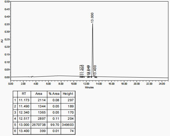 步骤4、将色谱柱用去离子水平衡后上样,上样量为50ml,纯度大于99%的美拉诺坦 I三氟醋酸液体,在2%醋酸水溶液体系下洗脱 50min,将收集的目的产物旋转浓缩至80ml,进行预冻干、冻干处理,最终得到美拉诺坦 I精品肽5.33g,收率为32.33%。