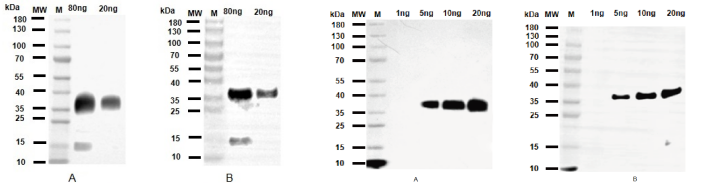 1. 样本:重组His-METRNL蛋白(30.7kDa) | 上样量: 80ng、20ng、10ng、5ng、1ng