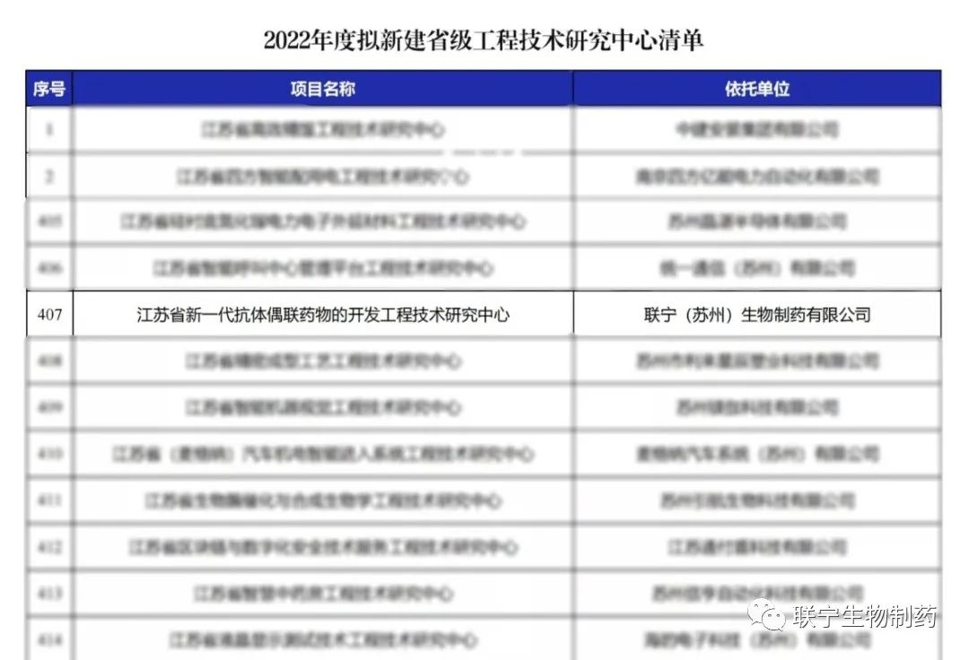 近日,2022年省级工程技术研究中心新建工作,经各企业提交材料,设区市和计划单列试点县(市)科技局、国家高新区管委会组织申报、材料审核、专家咨询、公示,省科技厅审核等流程,2022年拟新建省级工程技术研究中心项目予以公示,联宁(苏州)生物制药有限公司榜上有名。