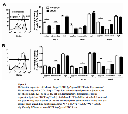 由于Helios的表达被报道能区分胸腺来源的天然(nT)和外周诱导的调节性T细胞(iT),作者分析了其在脾脏和两个BB亚株的PLN中的表达。如图5所示,BBDR.lyp/lyp和BBDR大鼠脾脏和脾组织中Helios的表达水平不同。在所有时间点,BBDR大鼠表现出较高比例的T表达中间水平的Helios,以及较低比例的T表达阴性/低水平的Helios(图5)。在60日龄时,BBDR.lyp/lyp与BBDR大鼠的Helios和Helios-Treg的百分比显著不同,而Helios种群的频率在两个品系中相似。