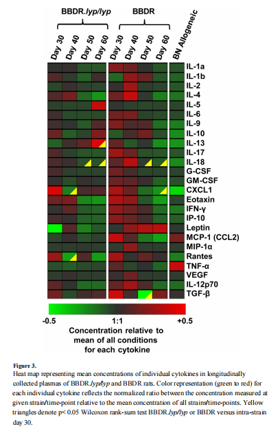与第40天BBDR血浆诱导的强烈炎症基因表达一致,BBDR大鼠在第30天和第40天普遍观察到较高的细胞因子水平。然而,在50天和60日龄时,这一水平会降低,作者将其解释为诱导免疫静止状态(图3)。在BBDR.lyp/lyp大鼠中,尽管有自发的疾病进展,但通过ELISA检测外周细胞因子水平升高的普遍失败很可能是由于其淋巴细胞减少。